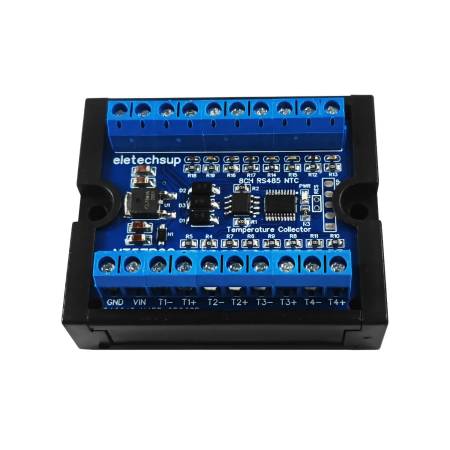 8 Channel Thermistor IO Expander reads both temperature in Celsius from Standard NTC 10K probes, or can return just the resistance for each of 8 channels, measured from 0 to at least 200k Ohms. Connect: ezeio D0 -> B- ezeio D1 -> A+ ezeio 0V -> GND ezeio +V -> VIN